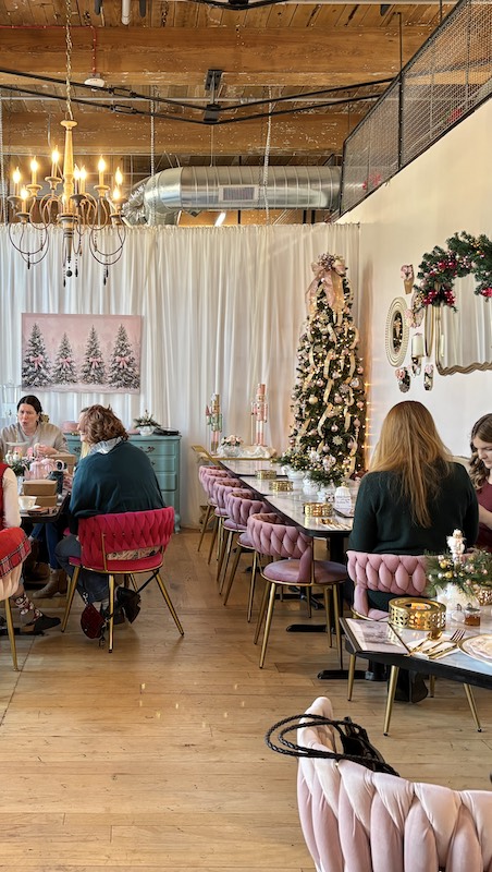 Inside this huge 123-year-old renovated cotton mill, Cheryl rolls a tea cart from Sweety’s shop to the tea room down the hall. After an early stint in a spot that passing shoppers could traverse, this year Cheryl beautifully furnished a new, more private space that feels more intimate. We happily returned to experience this new tearoom, as well as their Christmas Tea menu, which introduced us to a new favorite afternoon tea savory. We finished our outing with one of our favorite ways to walk off afternoon tea indulgences: by hunting for local and thrifted gifts at The Mill on Etowah shops.